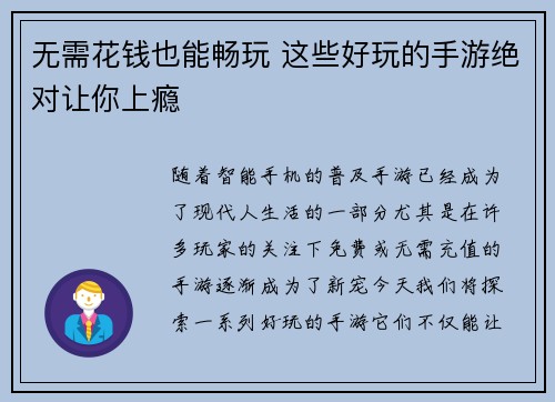 无需花钱也能畅玩 这些好玩的手游绝对让你上瘾